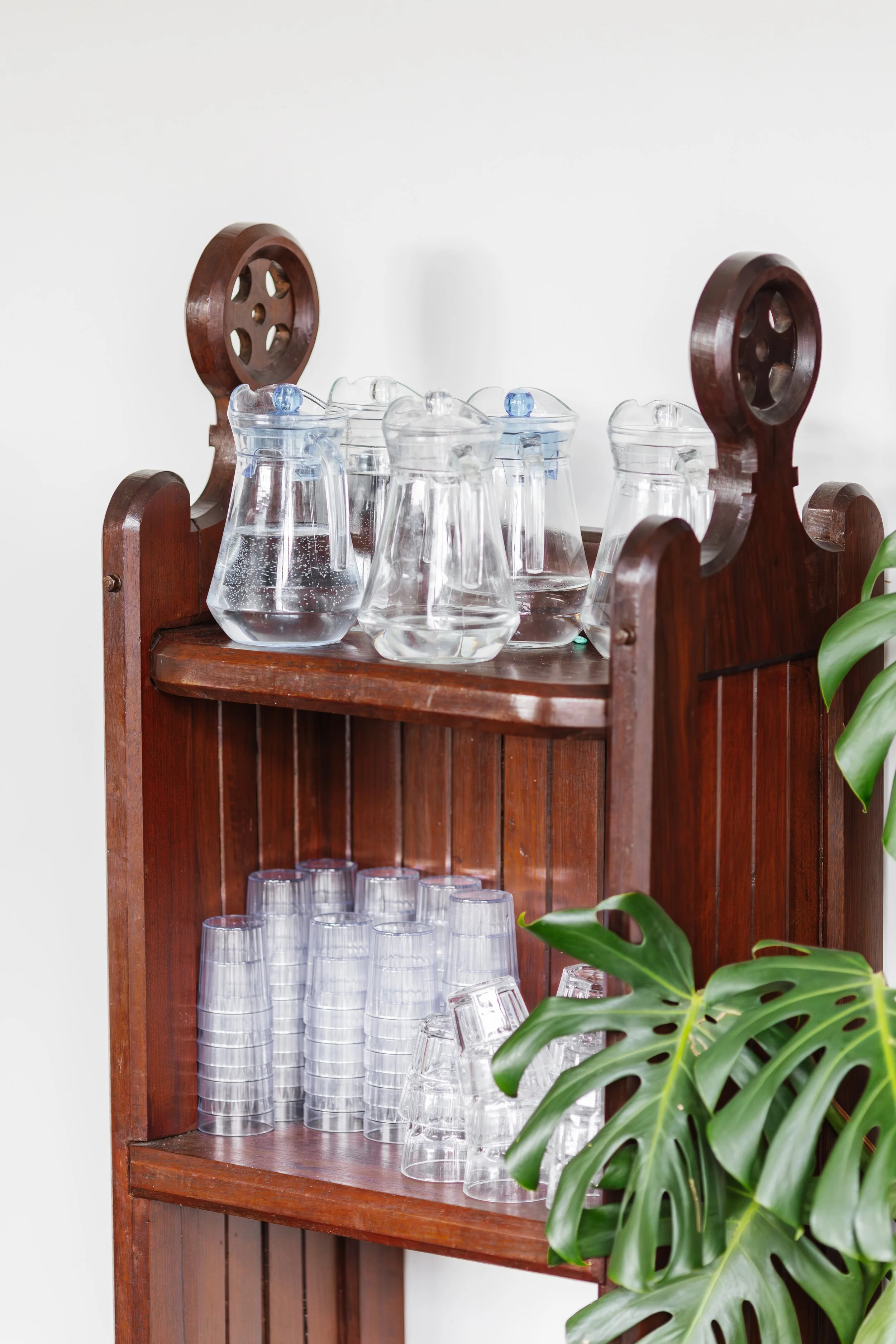 An old bishop’s chair was repurposed into a drink station, and a short pew was refinished to use as the seating option outside the soft play area. We sourced a shoe storage cabinet in orange for this space.